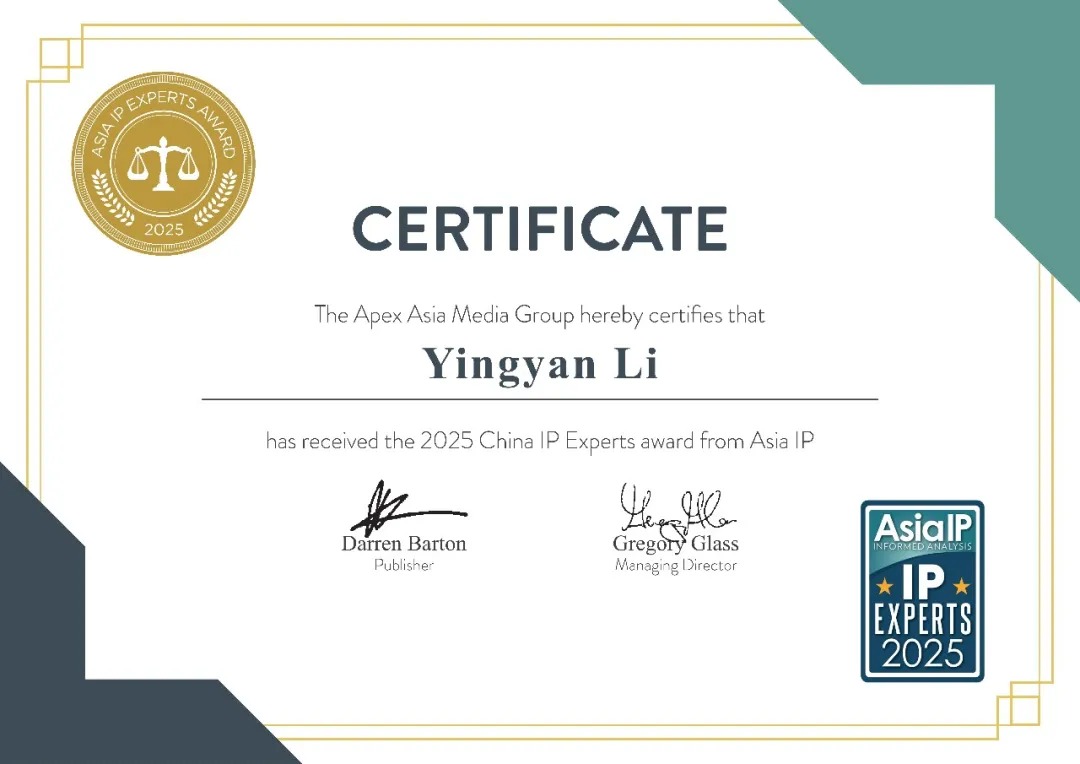 朗報!国際的な権威ある知的財産権専門誌「Asia IP」が発表した2025年度中国トップ100知的財産専門家の選考結果において、鉦霖知識産権所長の李英艶先生が栄えある選出を果たし、さらに2025年度中国トップ100知的財産専門家賞を受賞した!